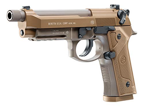 Officially licensed by Beretta, the Umarex M9A3 is a faithful reproduction of the 9mm firearm it simulates. From its blowback-action slide and faux suppressor-accepting, threaded barrel, to the three-point picatinny rail under the front of its frame and full-sized magazine, this FDE-colored lookalike is a dead ringer for the real powder burner. It even fits holsters designed for the M9A3 firearm. This C02 air pistol’s realism are an authentic, ambidextrous safety, standard-function magazine release button and thin, Vertec-style, plastic grips. What’s more, this model features a full-auto function for blasting through its 18-round BB magazine with one tug on the crisp, clean-pulling trigger.