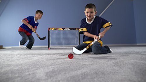 Bring the thrill of hockey games home with knee hockey! Exciting and challenging, knee hockey is a great way to teach first-timers the basics of hockey and is ideal for young children. With a little imagination, suddenly they’re the star player of their favorite team, aiming for the goal with passion and precision! This set includes 2 mini hockey sticks, a mini foam hockey ball, and a goal. Add to the fun by buying a second set, and the team challenge is on! The Franklin mini hockey set includes everything you need for a fun, energizing game! Rainy day? No problem! Although you might have a clear “no running in the house” rule, you can play knee hockey anywhere at home. Practice your shooting or goalie skills with this fun mini hockey game that also makes for a great gift!