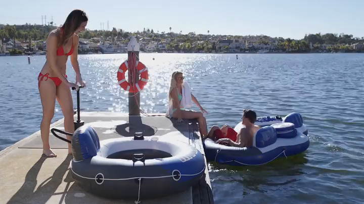 Designed with two lounges that are interconnected and a large built-in cooler with lid, this lounge is perfect to float with a friend.^The built-in backrests provide easy cruising and a mesh bottom keeps you cool.^This fun Lounger has five air chambers for added safety, and two built-in cup holders to keep your refreshments nearby as you relax in the water^Easy-to-use connectors are included for fastening it to other intex River runs