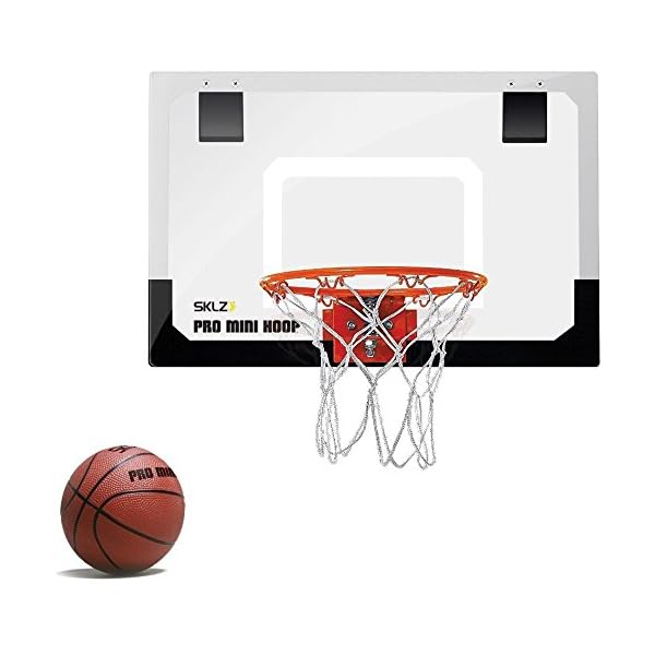 The SKLZ Pro Mini Basketball Hoop is the perfect way to practice your 3 pointers or free throws without committing to a full game on the court. With a shatterproof backboard, and ultra durable, 8 loop net, it can handle the swoosh of powerful athletes, and the rough and tumble play of kids. Set it up in your bedroom, basement, playroom, or at the office. With pre-installed over the door hooks, you can guarantee easy set up for fun, no hassle shots. With foam installed behind the shatterproof polymer backboard and metal brackets to reduce noise pollution, you can shoot hoops anytime of the day or night without the worry of bothering your neighbors, parents, or coworkers. Keep kids active indoors, or take a few shots during the day between meetings or classes. The professional grade basketball hoop with a breakaway rim allows for slam dunks, layups, bank shots, and more. You can be sure that your fun will last, with easy and quick set up. The SKLZ Pro Mini Playground Basketball Hoop package includes a 18”x”12 polymer backboard with a brushed metal finish, pre-installed padded brackets that hook over your doorframe, a 5” Mini Pro rubber basketball, a 9” diameter spring action break-away steel rim, and a wrench. Set up and start shooting baskets in a matter of minutes.