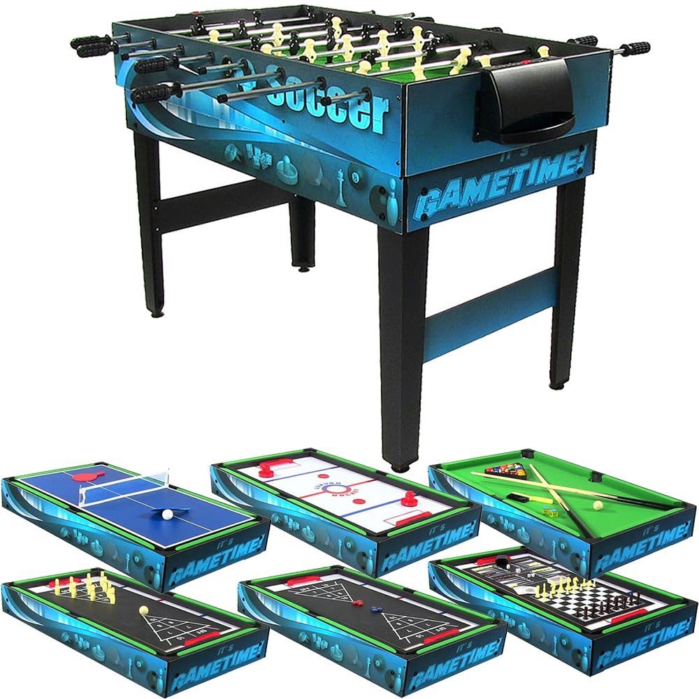 10-IN-1 COMBO GAME TABLE – Interchangeable tabletop lets you play slide hockey, foosball, pool, shuffleboard, table tennis, chess, cards, checkers, bowling, and backgammon